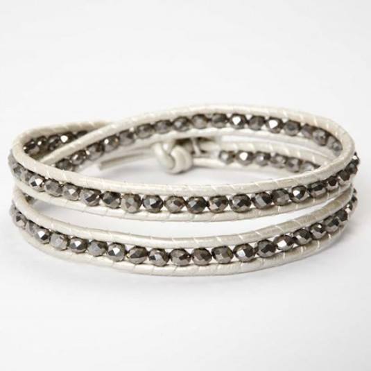 Lær å lage armband av svart geiteskinn (ikkje kvitt som på biletet) og grå/sølvgrå fasettperler. Etter kurset får du med deg ditt unike armband heim.